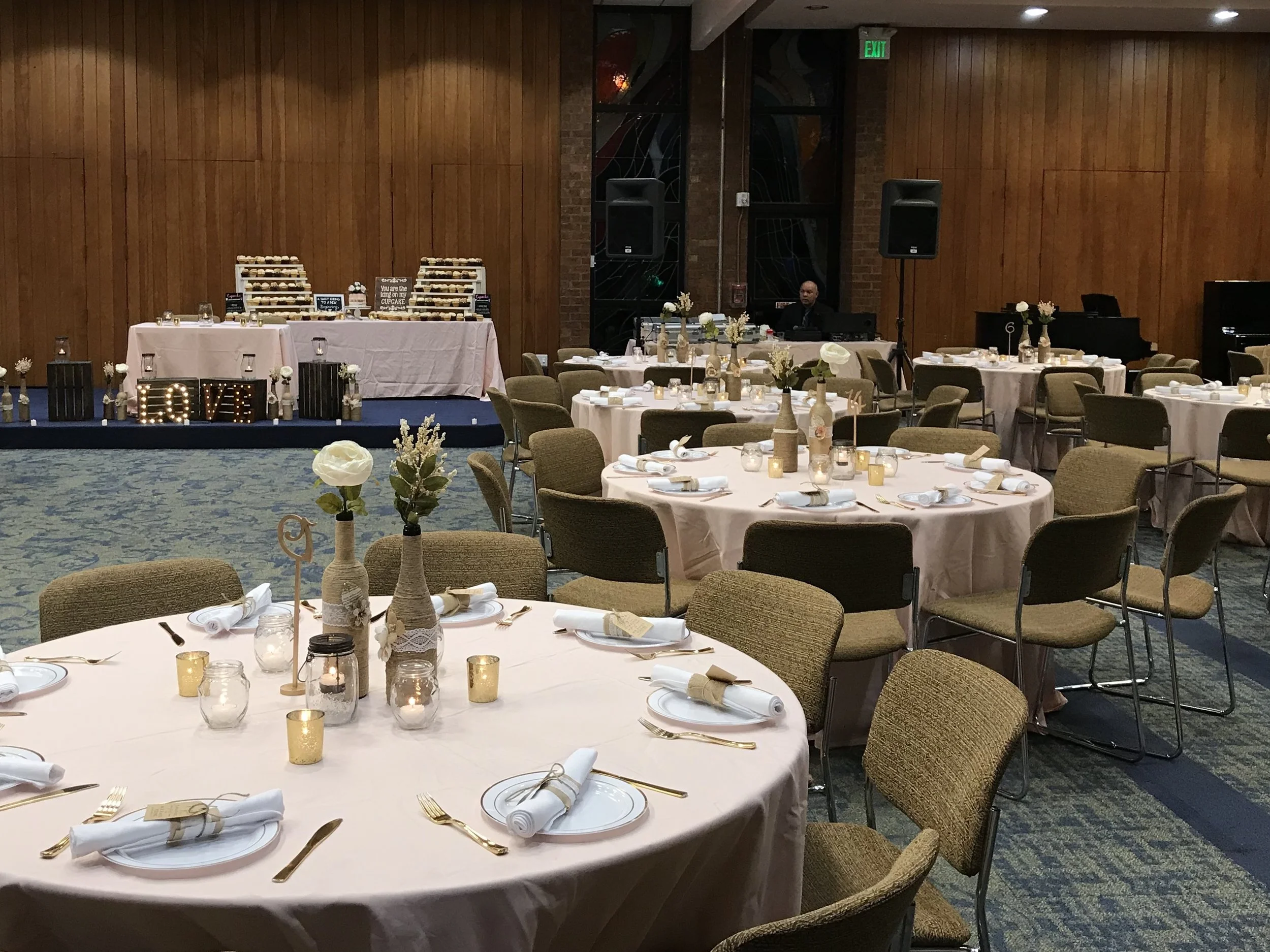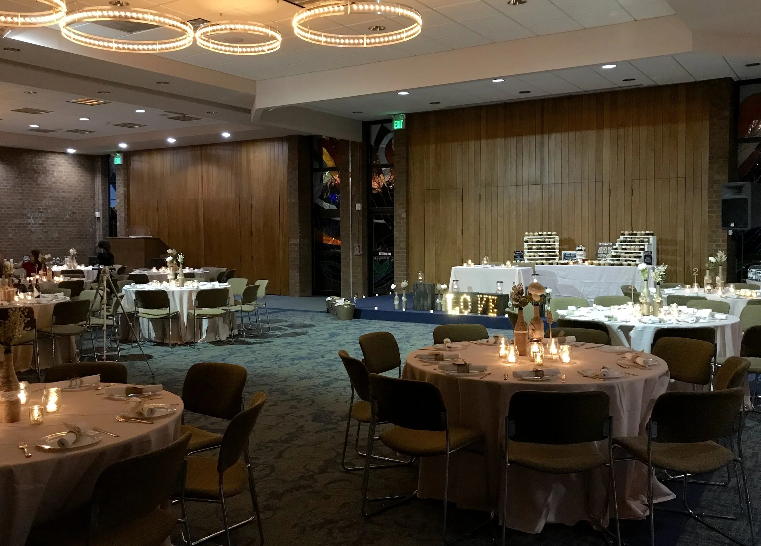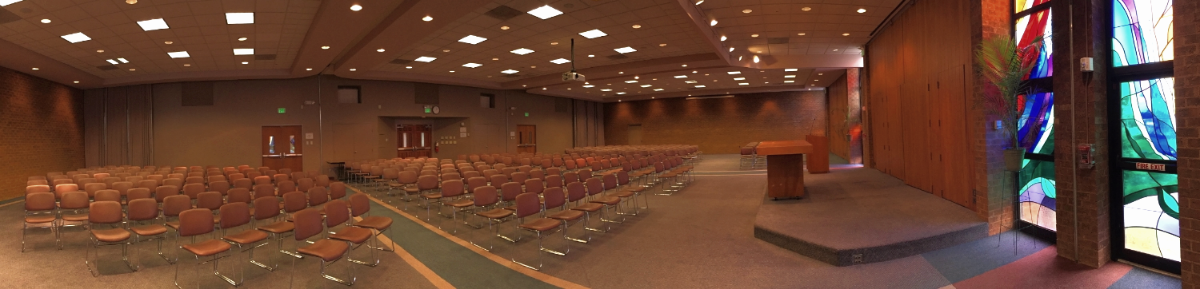 Rooms 200/201/202 (1,500 sq ft each) feature the "Genesis" art glass windows, depicting the elements of earth, air, fire, and water. The Room 200 Complex can be configured to accommodate a variety of events. Floor-to-ceiling folding partitions divide the complex into Room 200, 201, and 202. Combination of two rooms of the Room 200 Complex permits auditorium-style seating for 264 and banquet-style seating for 128. When all three rooms are combined, our largest capacity room holds 410 auditorium-style or 250 banquet-style. The room's audio-visual system includes a house sound system, wired microphones and an automated retractable projection screen. Free WiFi is available throughout the facility. Grand and upright pianos are available at no additional charge; an organ is available for rent. Recessed and fluorescent lights on dimmer switches provide a variety of lighting options. Room 202 and the Room 200 Complex (Rooms 200, 201, and 202 without partitions) feature direct access to the commercial kitchen for catered events.